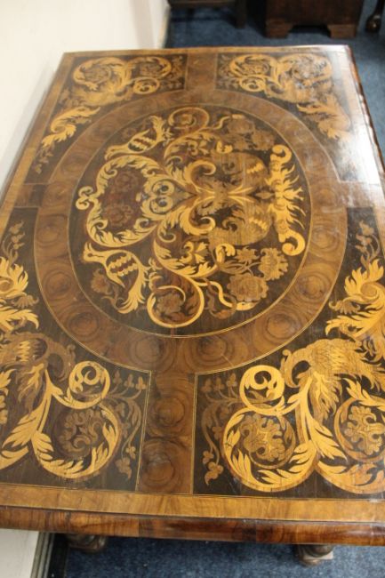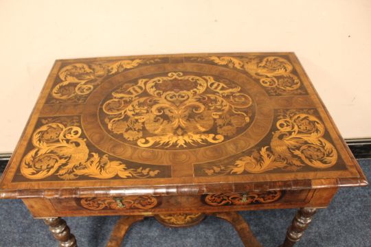A WILLIAM AND MARY STYLE WALNUT OYSTER VENEERED AND INLAID SIDE TABLE, the top having elaborate inlaid detail with mythical birds and foliate decoration, single frieze drawer, raised on turned supports untied by a shaped undertier, on bun feet, H 75 cm, W 96 cm, D 64 cm