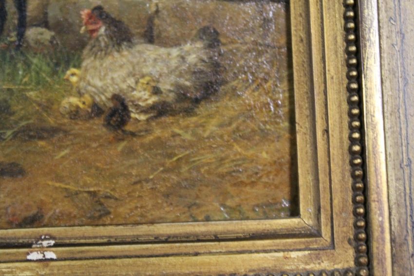 ATTRIBUTED TO CARL JUTZ (1916-1960). Farmyard scene with numerous chickens, signed lower right, oil on panel, framed, 17 x 22 cm