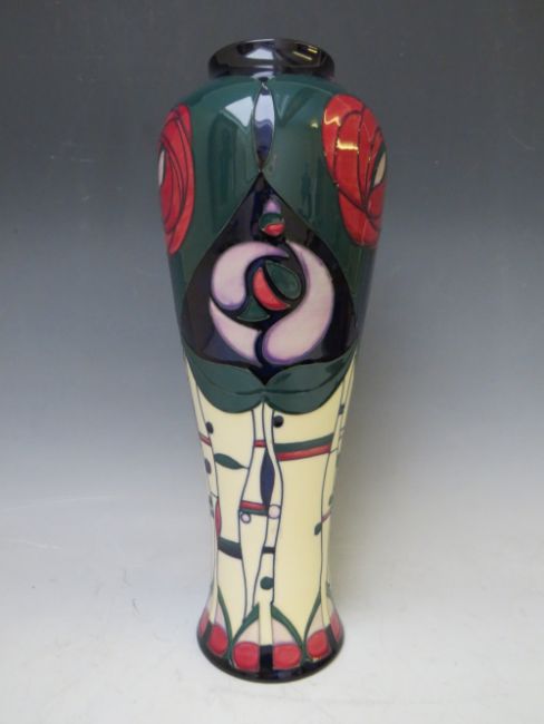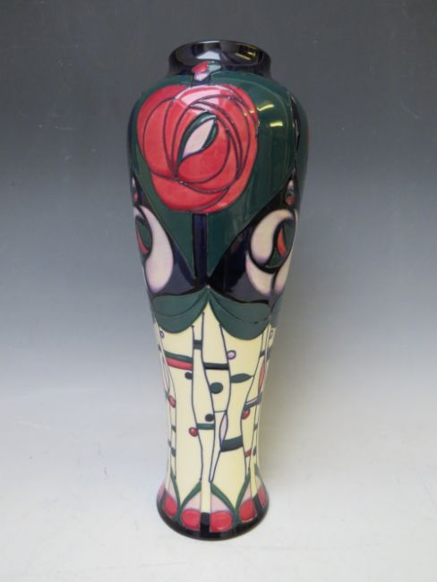 A MODERN MOORCROFT POTTERY "TRIBUTE TO CHARLES RENNIE MACKINTOSH" PATTERN HIGH SHOULDERED VASE, designed by Rachael Bishop, of tall slender form, printed and painted marks to base, H 37 cm
