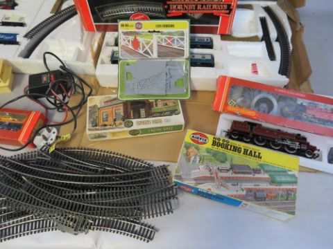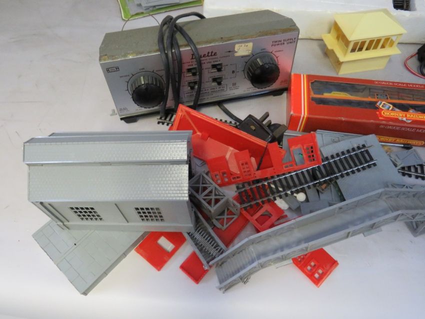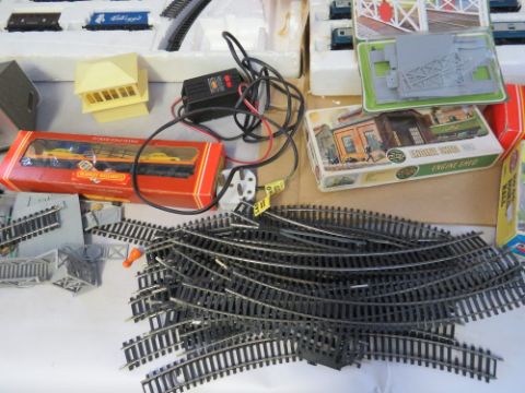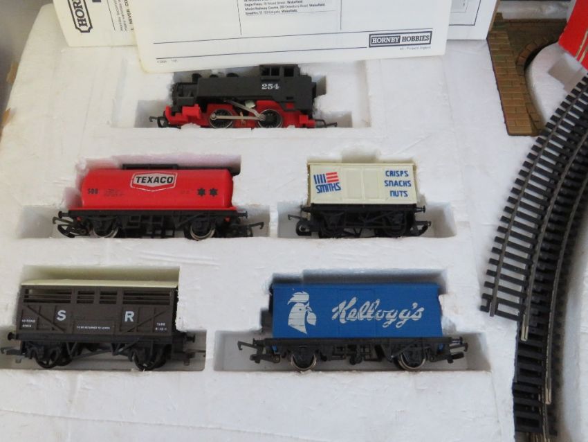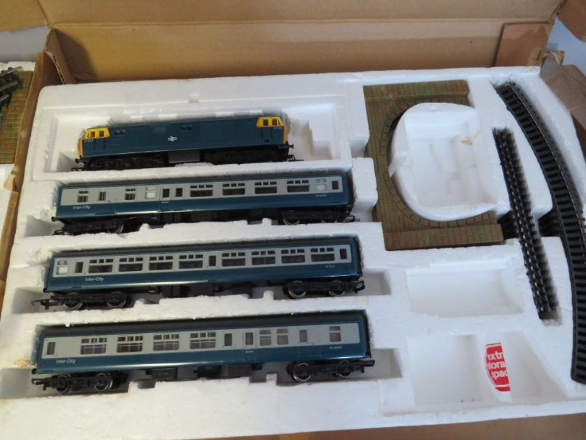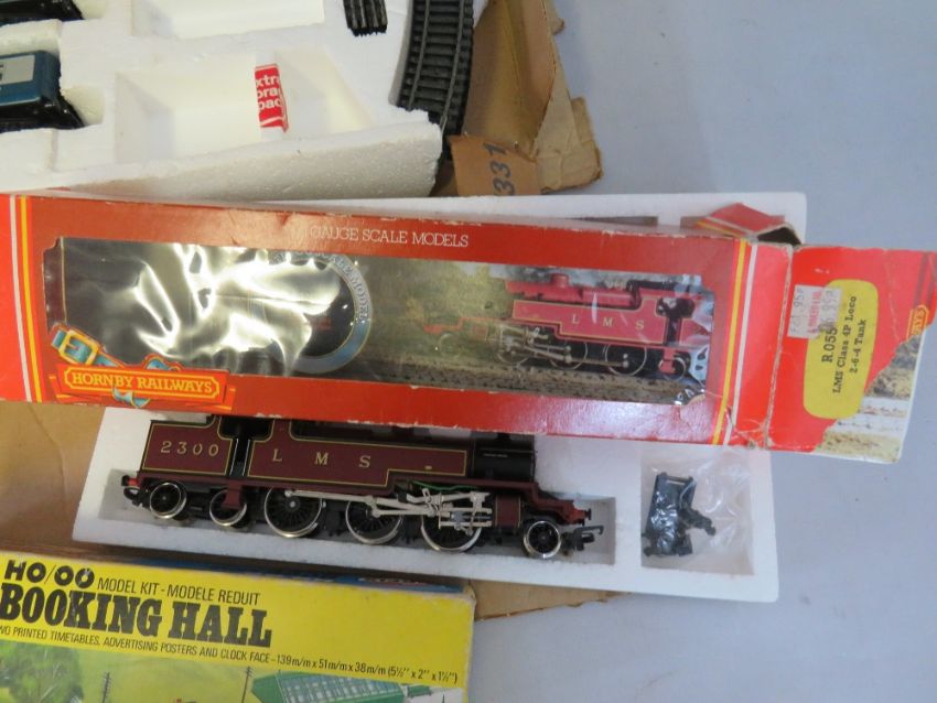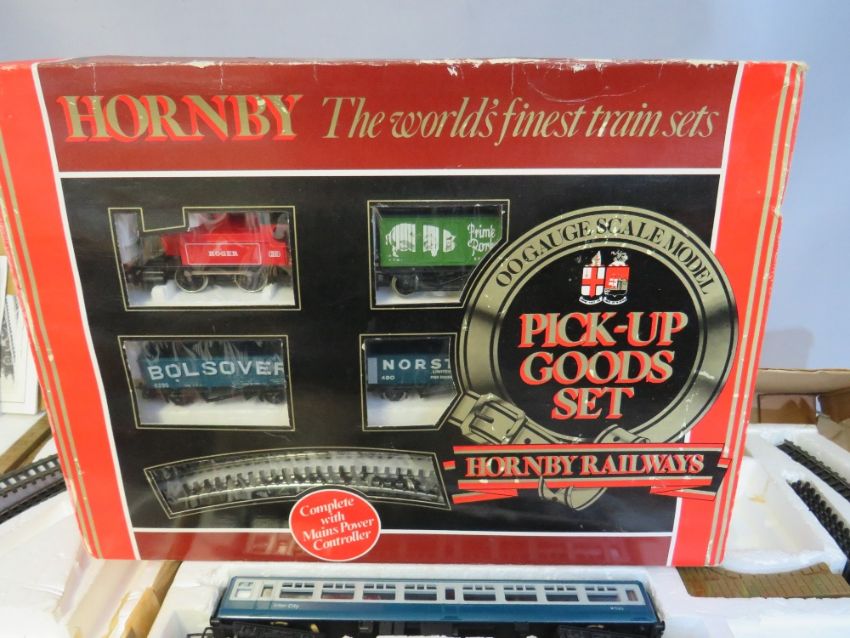 THREE BOXED HORNBY '00' GAUGE TRAIN SETS TO INCLUDE DIESEL INTERCITY SET WITH THREE CARRIAGES, Hornby Pick Up Goods set and another goods set - two box lids are missing, boxed Hornby LMS Class 4P 2-6-4 Tank Locomotive Ross, boxed car transported R126, bag of buildings and a bag of track plus three kits, together with a Duette power control