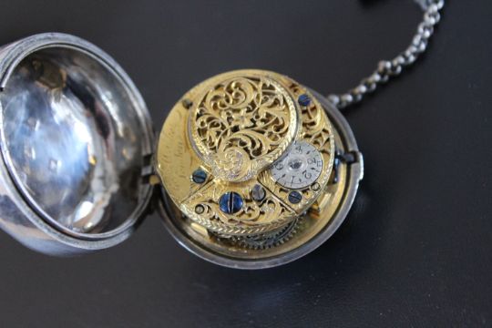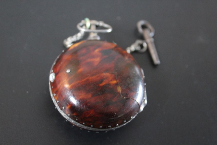 AN EARLY GEORGIAN TORTOISESHELL AND HALLMARKED SILVER PAIR CASED VERGE POCKET WATCH BY ROBERT WALKER OF LONDON 1767 , No. 10326, silver casing dated 1767, on four pillars with intricate foliate scroll pierced balance cock, typical pin detail to the edging of tortoiseshell casing, with key, Dia 5 cm