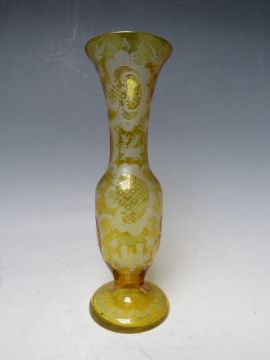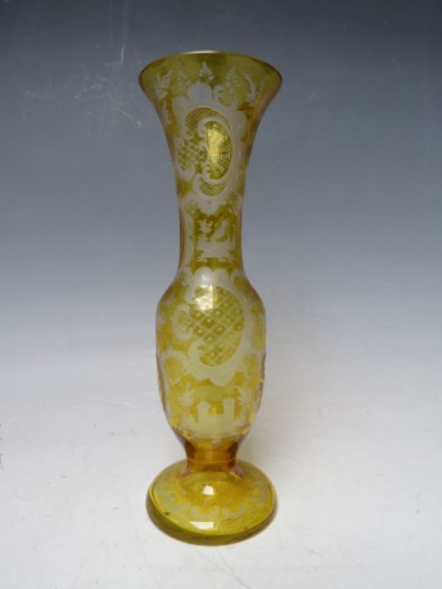 TWO ITEMS OF VINTAGE GLASS, comprising a Bohemian citrus glass bud vase with engraved / etched decoration of houses, landscapes and animals, H 20 cm, together with a small decorative comport