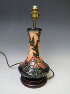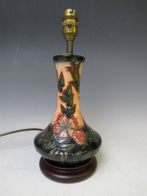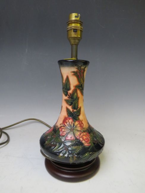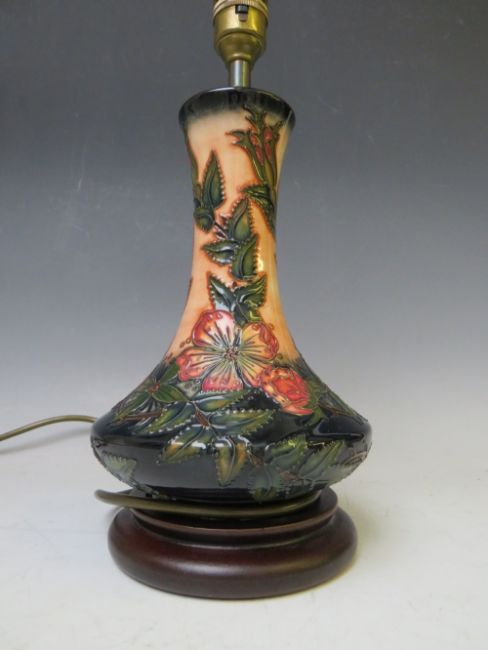 A MODERN MOORCROFT SWEET BRIAR PATTERN TABLE LAMP WITH SHADE, of globe and shaft form, on a turned wooden base, H 31.5 cm (top of bulb fitting, not including shade)