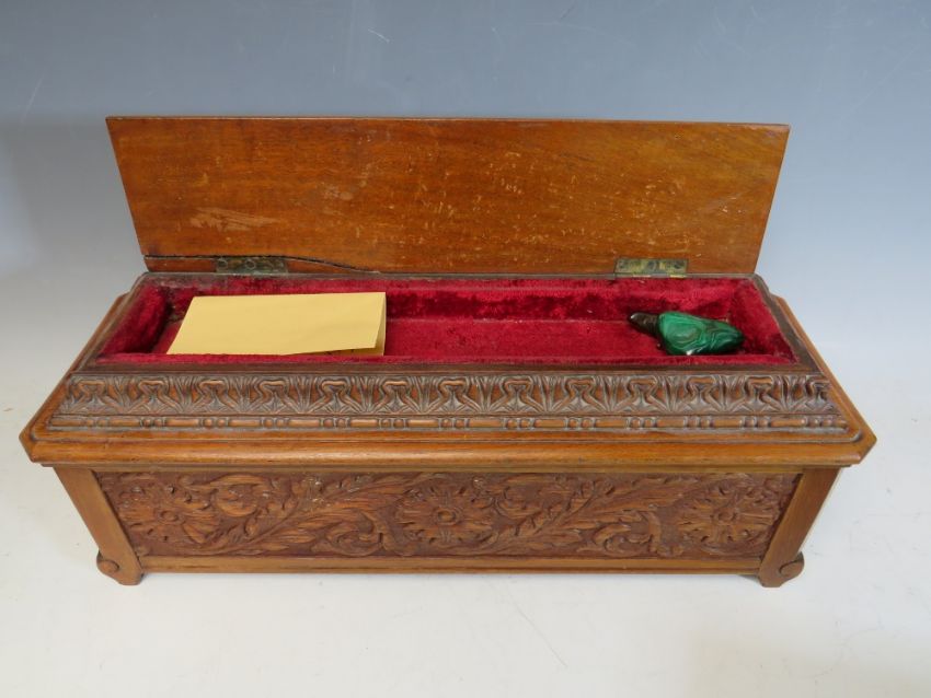 THREE ANTIQUE TREEN BOXES, comprising a carved rectangular example with additional hinged storage compartment to lid, L 39 cm, a miniature parquetry chest of three drawers and another lidded box with brass portrait surmount to lid (3)
