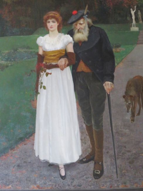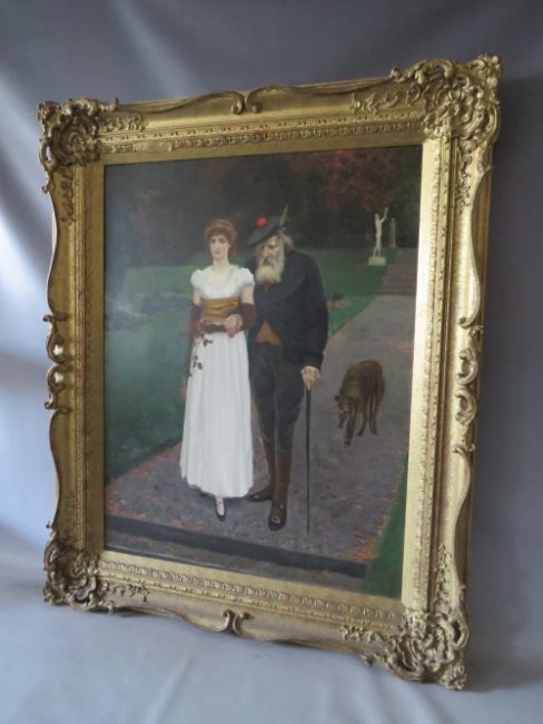CHARLES HAZLEWOOD SHANNON (1863-1937). A young girl and her grandfather taking a walk in an ornamental garden with dog following behind 'A Gentle Walk', see verso, signed with monogram lower right, oil on canvas (relined), framed, 91 x 69 cm