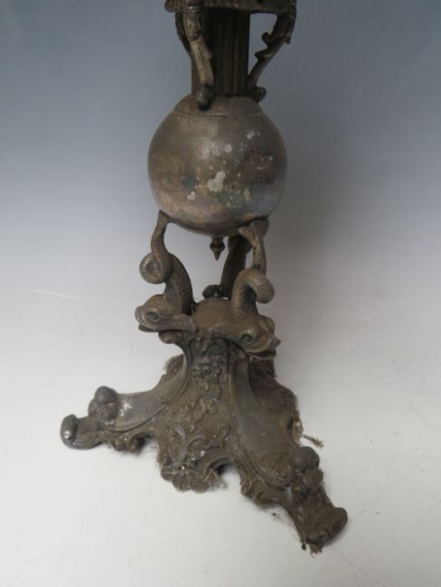 AN UNUSUAL 19TH CENTURY OIL LAMP, with clear reservoir, the plated column with fish and globe detail, H 39 cm