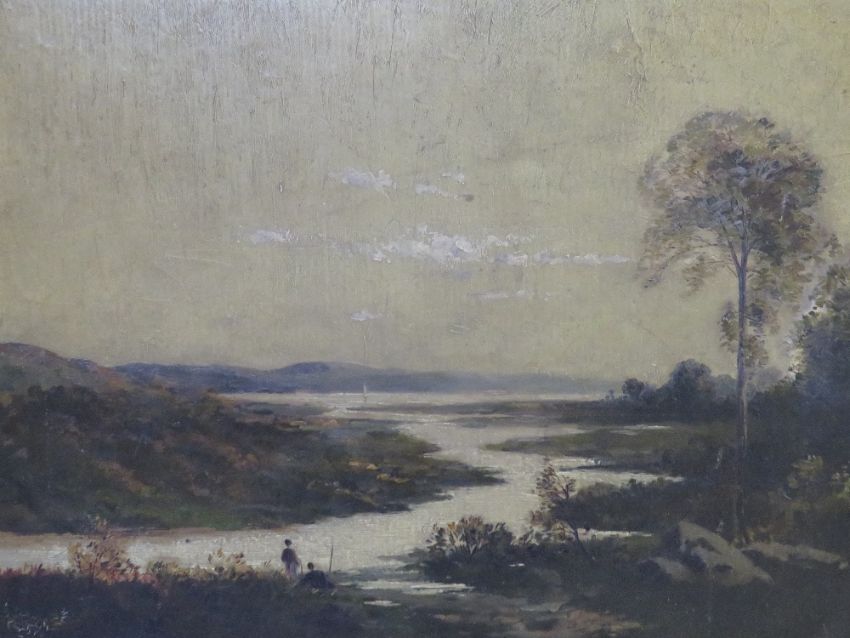(XIX-XX). British school, extensive wooded loch scene with anglers, unsigned, oil on board, framed, 24 x 34 cm