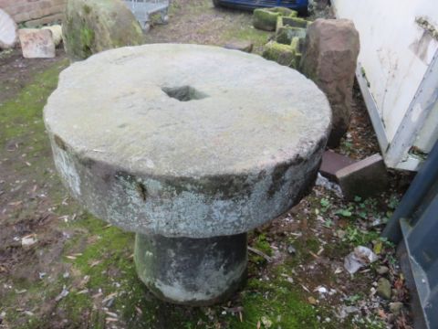 AN ANTIQUE SANDSTONE MILL STONE ON STAND, H 73 cm