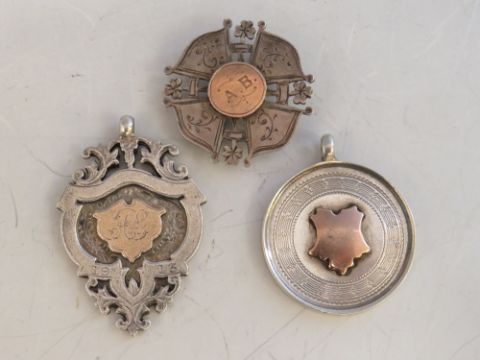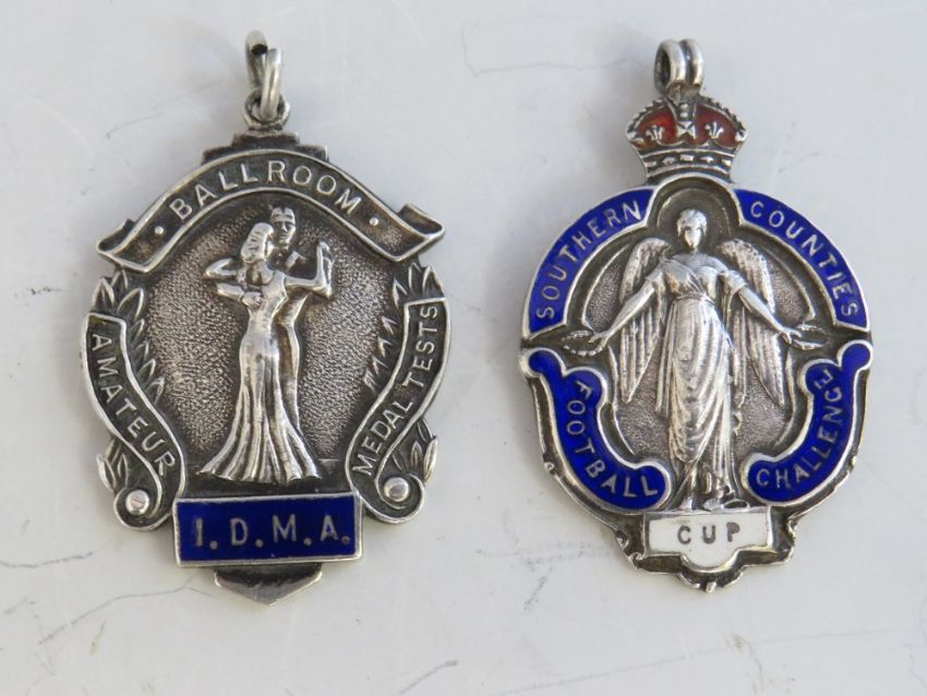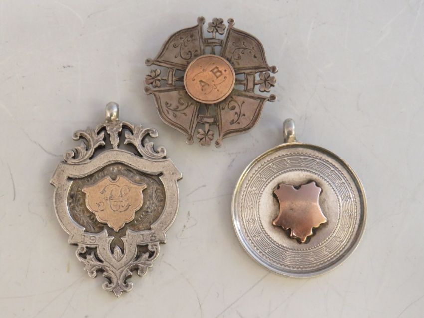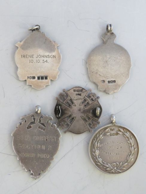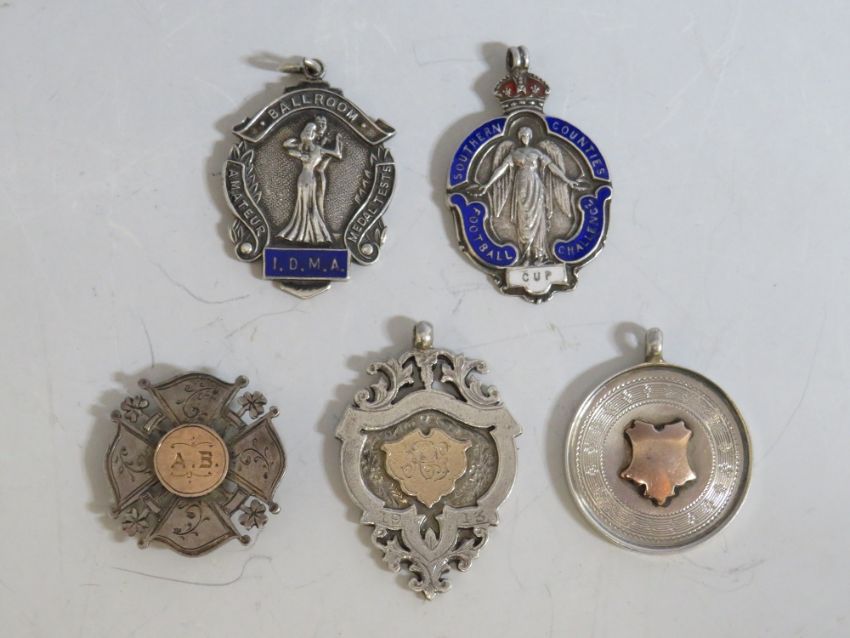 FOUR VINTAGE HALLMARKED SILVER FOBS, two with enamelling, together with a hallmarked silver and yellow metal brooch A/F (5)
