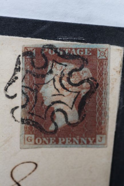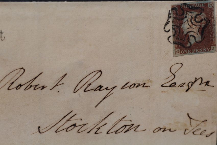 POSTAGE STAMP - 1841 1d RED, on deeply blued paper, on cover Neacham to Stockton on Tees, FU, black Maltese cross with NEASHAM PENNY POST full strike alongside