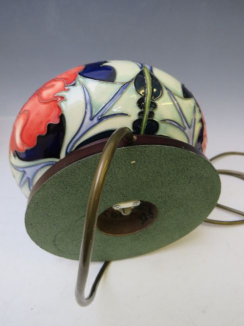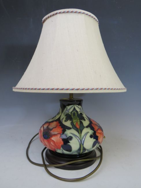 A MODERN MOORCROFT POPPY TABLE LAMP WITH SHADE, designed by Rachel Bishop, of bulbous form,on a turned wooden base, H 27 cm (top of bulb fitting, not including shade)