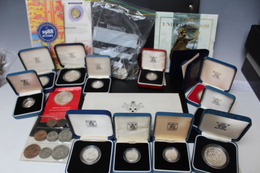 A GROUP OF COLLECTORS COINS, to include various Royal Mint silver proof crowns and £1 coins, a Cayman Islands 1974 proof set etc. and a small quantity of loose coins