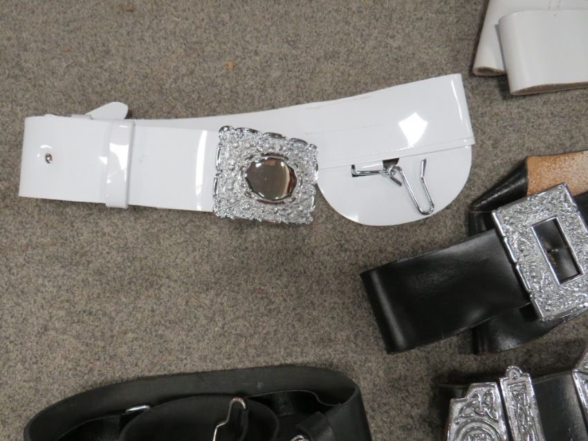 A SELECTION OF SCOTTISH MILITARY STYLE / MARCHING BAND BELTS, together with a collection of loose buckles and four kilt brooches