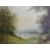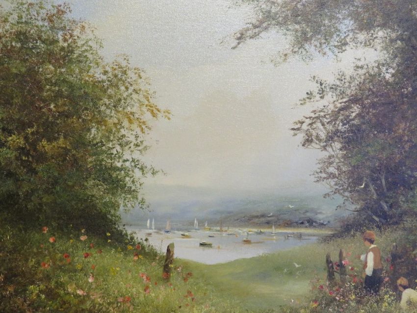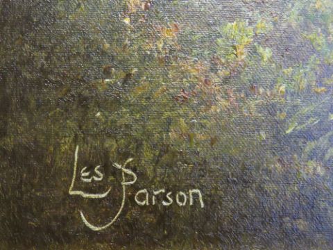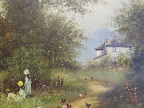 LES PARSON (XX). English school, extensive lakeland scene with children, cottage, chickens and sailing vessels,signed lower left, oil on canvas, framed, 44 x 90 cm