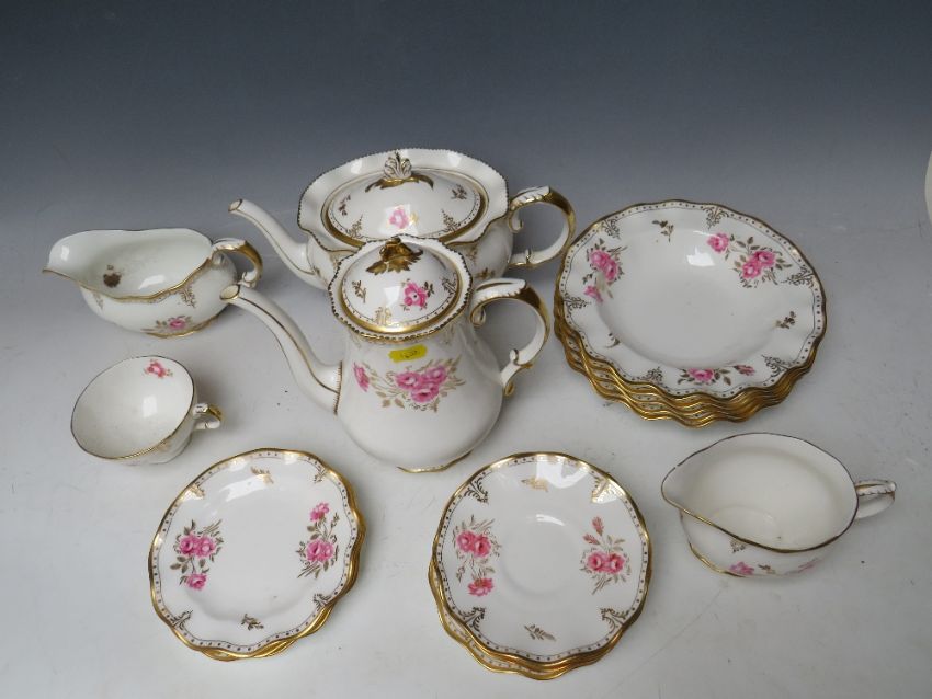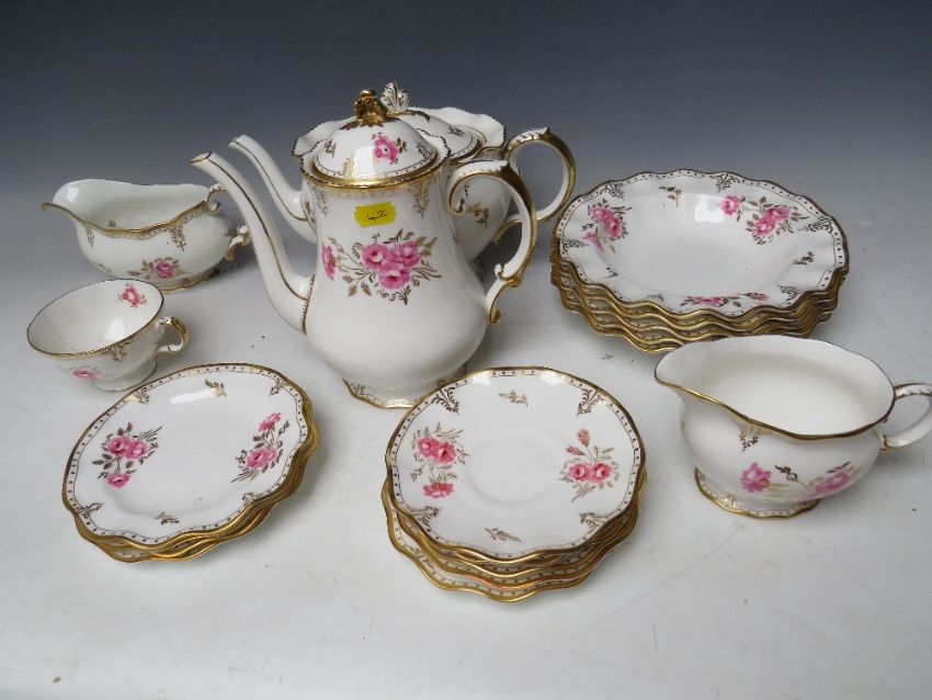 A ROYAL CROWN DERBY 'PINXTON ROSE' PATTERN PART DINNER SET, to include a tea pot - H 18 cm, a coffee pot - H 21 cm, five bowls - Dia. 22 cm, five saucers - Dia. 14.5 cm, four side plates - Dia.15 cm, one cup - H 6 cm, gravy boat - H 10 cm, milk jug - H 10 cm a/f with chip on rim (19)