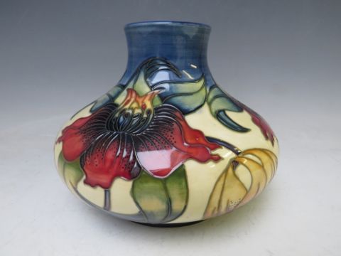 A MOORCROFT ANNA LILY PATTERN VASE, designed by Nicola Slaney, of compressed ovoid form, H 16.5 cm, impressed, painted and printed marks, silver line denoting second quality