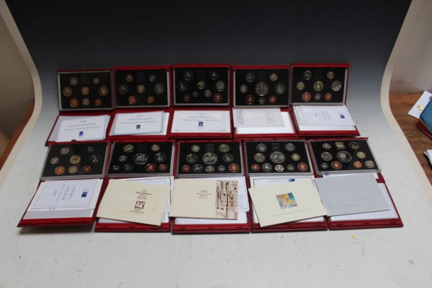 A COLLECTION OF TEN ROYAL MINT DELUXE CASED DECIMAL COIN SETS - 1990 THROUGH TO 1999