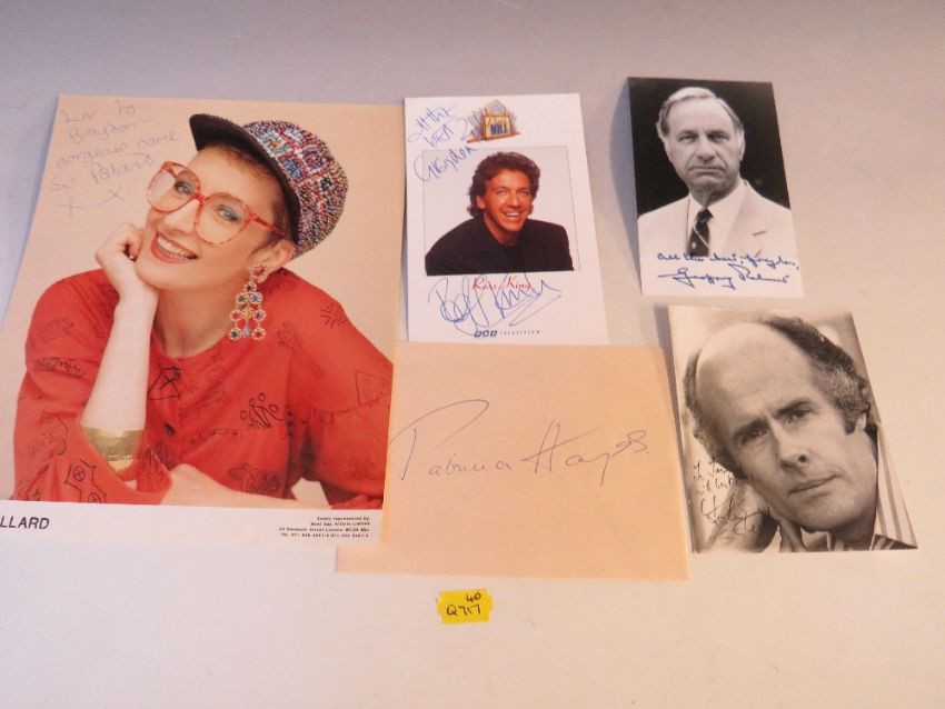 A TRAY OF AUTOGRAPHS AND PHOTOGRAPHS, LETTERS, CARD AND PAPER OF MAINLY FILM, THEATRE AND TELEVISION STARS, to include John Shaw, Melanie Sykes, Mel Smith, Dudley Sutton, Freddie Starr, Chris Evans, Victor Spinetti, John Savident, Elizabeth Hurley, Geoffrey Rush, John Gordon Sinclair, Dale Robertson, Willy Russell, Nicola Paget, Sue Pollard, Patricia Hayes, Ross King, Geoffrey Palmer, Brian Conley, etc.