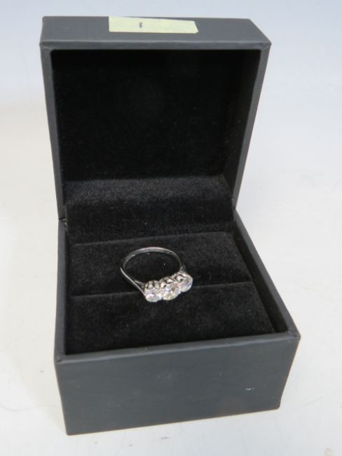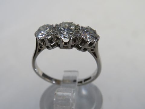 A LADIES MID CENTURY THREE STONE DIAMOND RING, the shank marked 18ct & Plat., large central stone approximately 1.2 carat, flanked by two smaller stones approximately 0.6 carat each