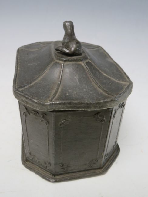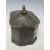 A 19TH CENTURY LEAD TOBACCO BOX WITH TAMPER, H 12 cm, L 12 cm, D 8 cm