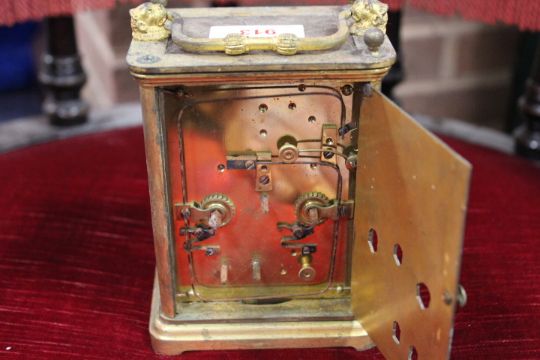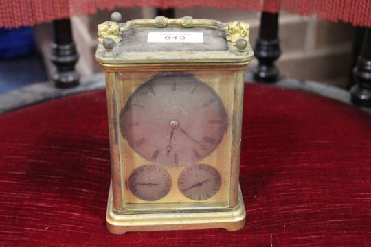 A LARGE GILDED TRAVEL ALARM CARRIAGE CLOCK, having three silvered subsidiary dials, the lower two dials displaying days and an alarm setting time, with hourly strikes on a slender shaped gong, A/F, H 14 cm