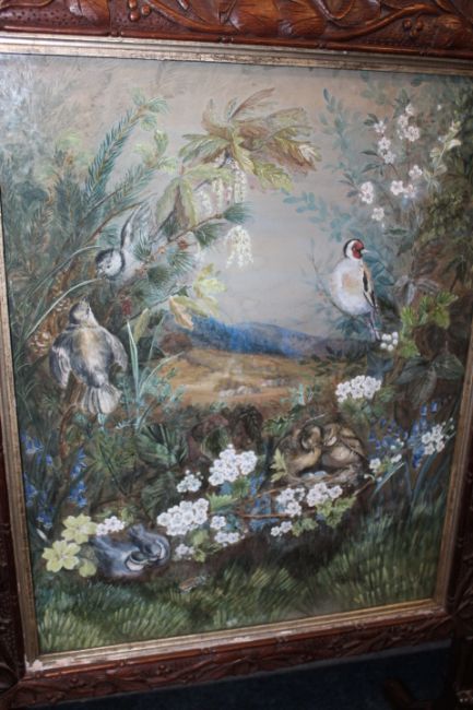 A 19TH CENTURY CARVED OAK FIRESCREEN WITH INSET WATERCOLOUR, carved with trailing vine leaves and grapes, raised on turned supports, the watercolour with nesting birds in a country landscape, H 96 cm, watercolour 54 x 42.5 cm