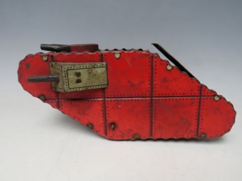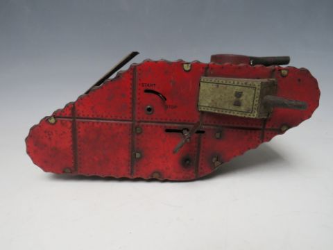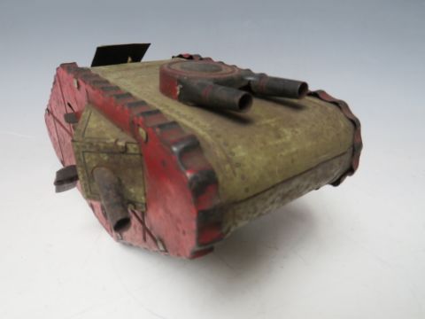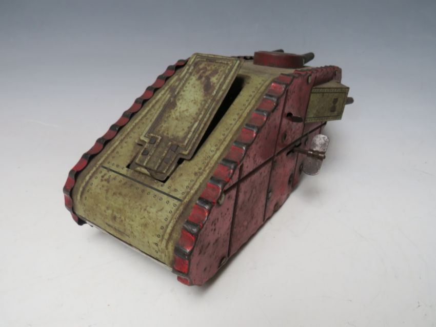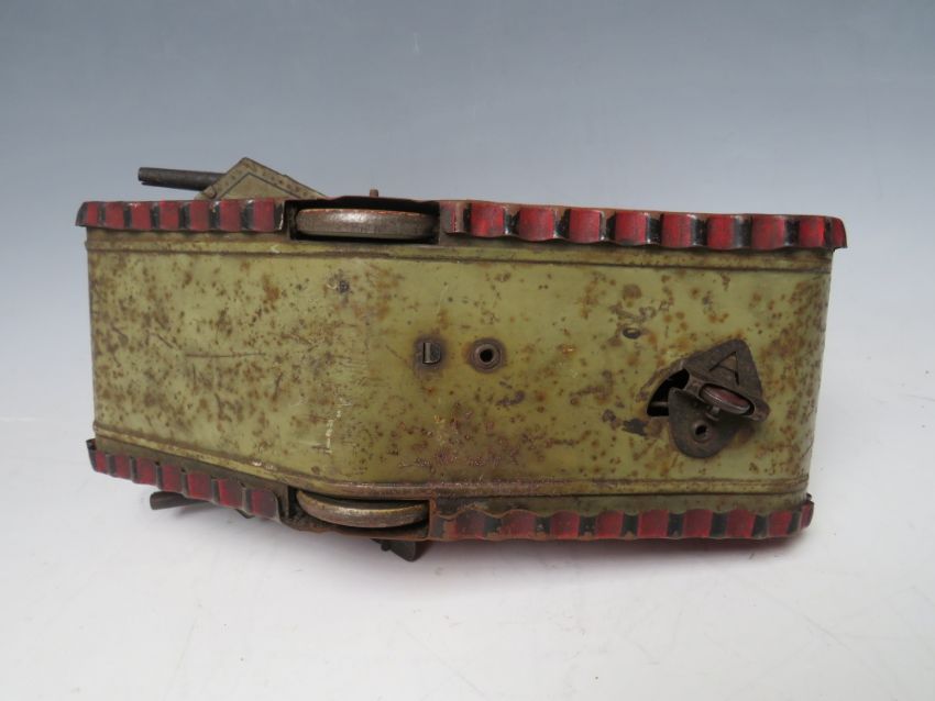 A VINTAGE TINPLATE CLOCKWORK FIRST WORLD WAR TANK, with figure inside, L 24 cm