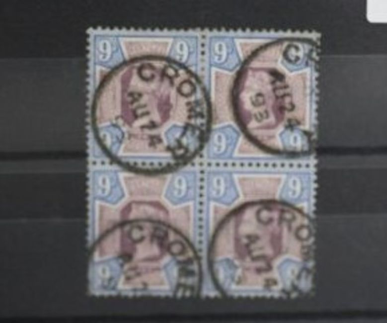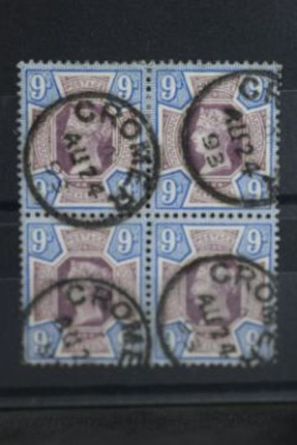 POSTAGE STAMPS - S.G. 209 1887 9d JUBILEE, a FU block of 4 with CROMER AV 24 93 cancels
