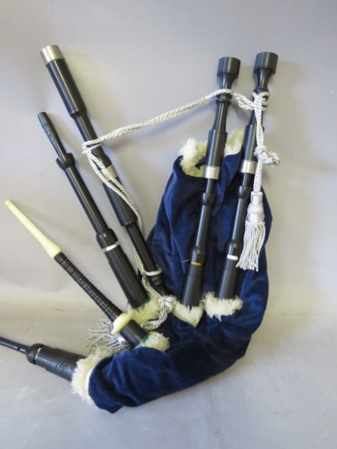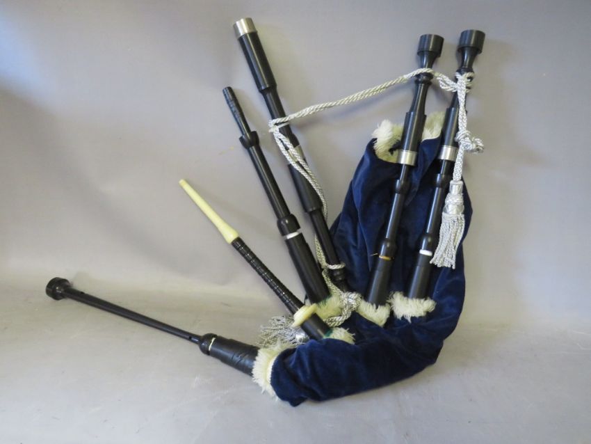 A SET OF LEON HIGHLANDER BAG PIPES, with thistle of Blantyre carry case