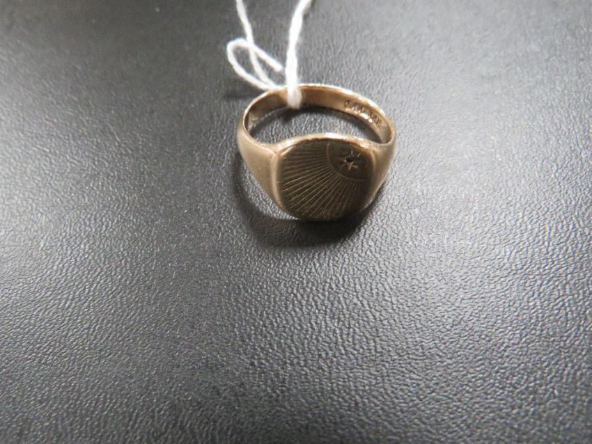 A HALLMARKED 9 CARAT GOLD GENTS SIGNET RING SET WITH DIAMOND CHIP - BAND SPILT AT BASE approx weight 5.7g RING SIZE T