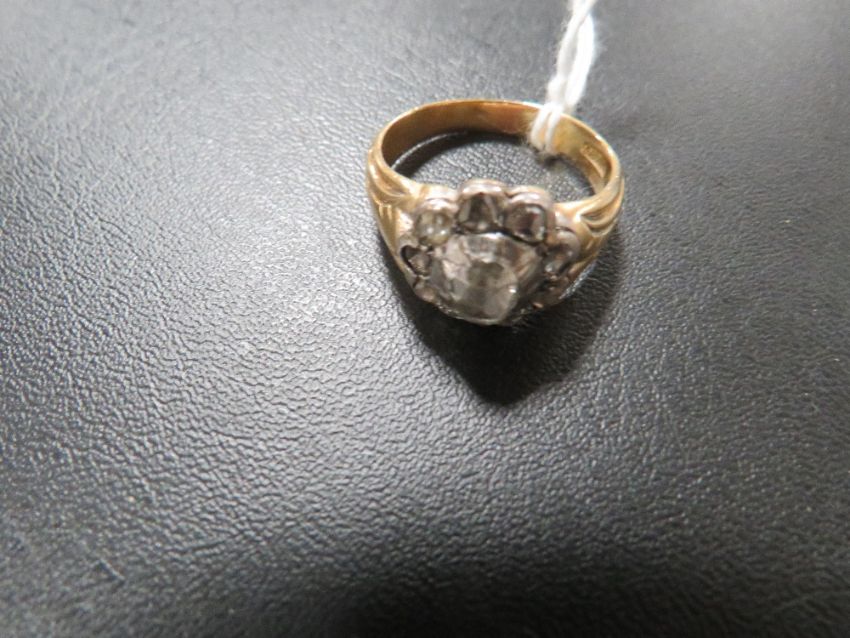 AN 18CT DIAMOND RING SET WITH AN OVAL - POSSIBLY OLD CUT - CENTRAL DIAMOND OF AN ESTIMATED 0.65 CARAT A/F, the diamond being chipped on one facet leading to a crack across the full diameter of the stone three quarters of the way down the stone, surrounded by eight old cut diamonds, with the ninth missing, approx weight 8.6g ring size Q 1/2