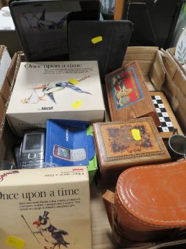 TWO TRAY OF ASSORTED SUNDRIES TO INCLUDE BOX VINERS CUTLERY, CHESS SETS, MOBILE PHONE ETC