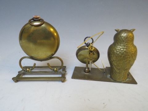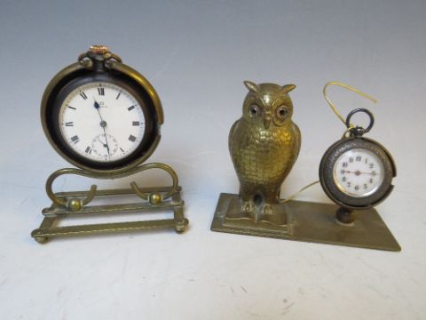 AN OMEGA POCKET WATCH HELD IN A BRASS HOLDER, with an owl fob watch holder and .935 fob watch (2)