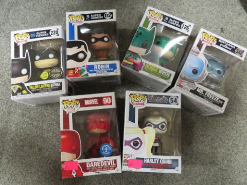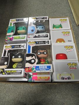 TWELVE BOXED POP FUNKO FIGURES - MAINLY BATMAN RELATED, TO INCLUDE BATMAN, ROBIN, PENGUIN, RIDDLES, HARLEY QUINN, MR FREEZE ETC