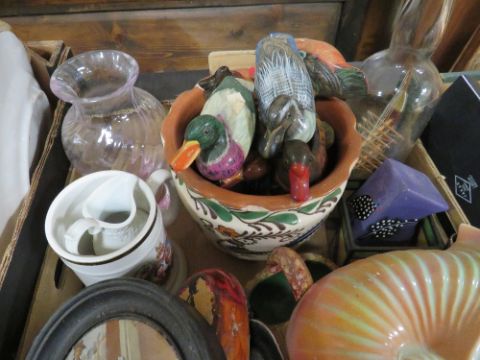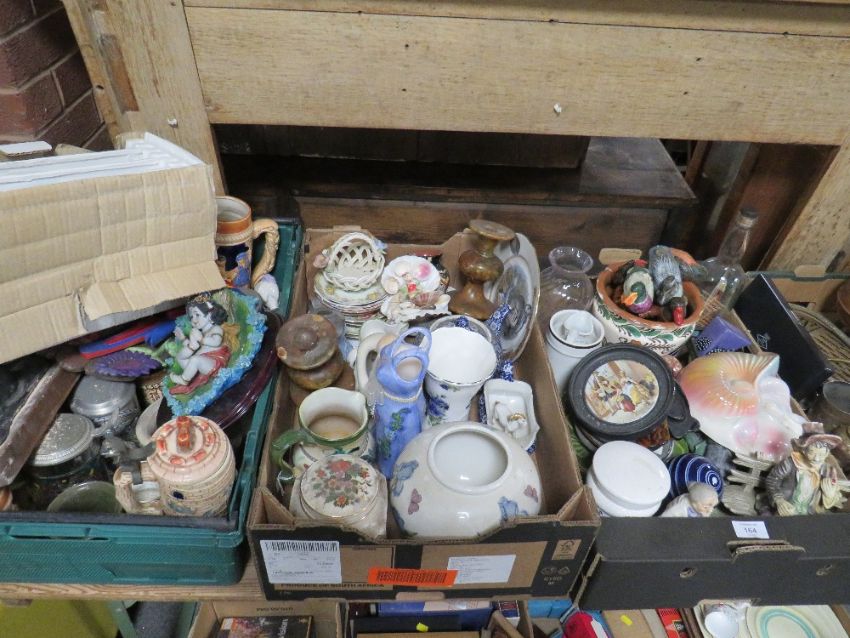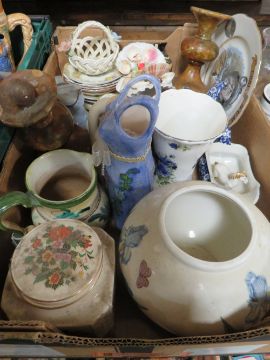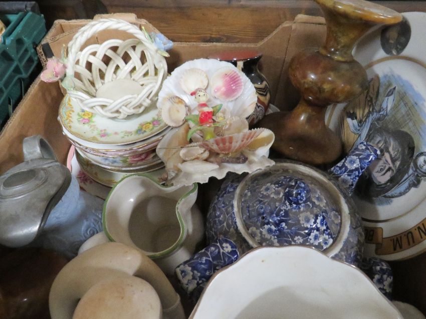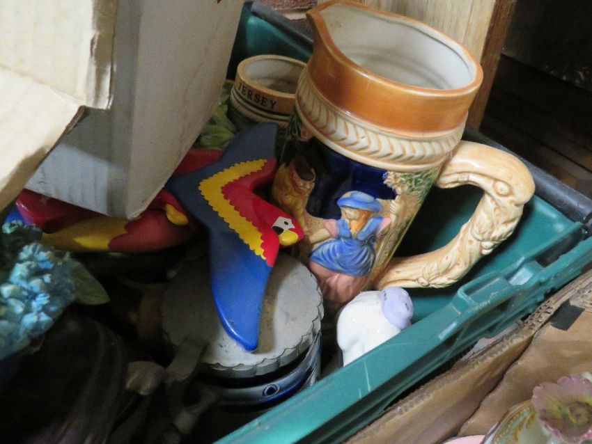 THREE TRAYS OF CERAMICS AND GLASS TO INCLUDE ASSORTED BEER STEINS, VASES ETC