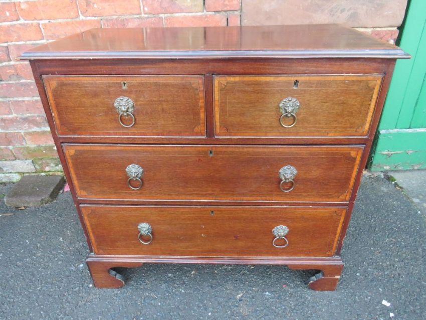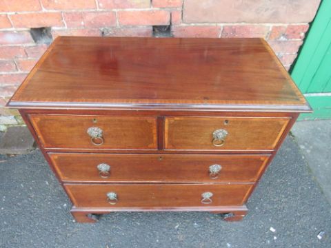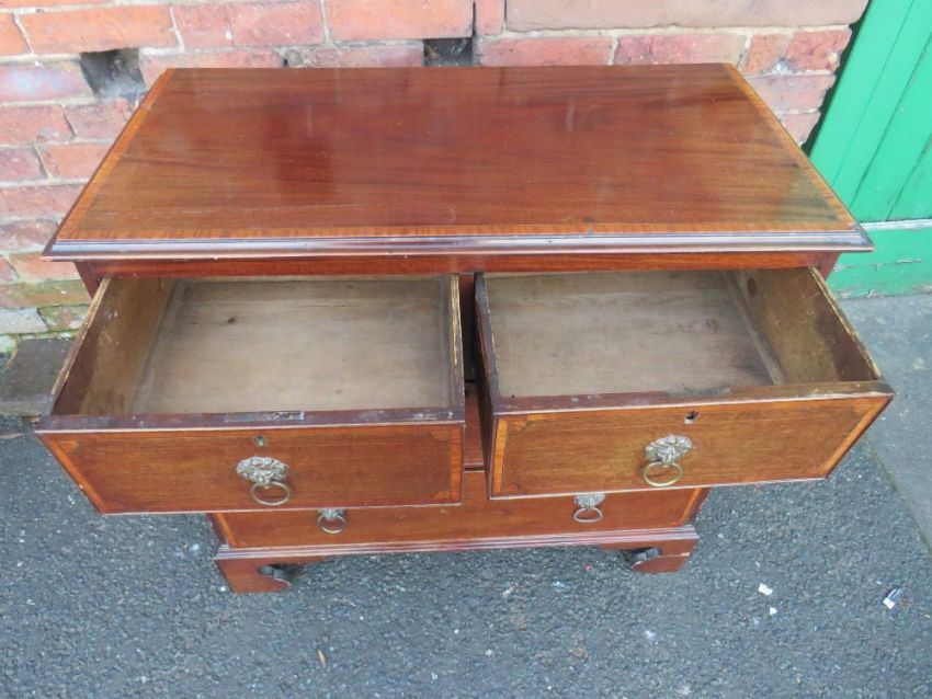 A 19TH CENTURY MAHOGANY CHEST OF SMALL PROPORTIONS, having two short above two longer graduated drawers, with crossbanded and inlaid satinwood decoration, H 81 cm, W 85 cm, D 43 cm