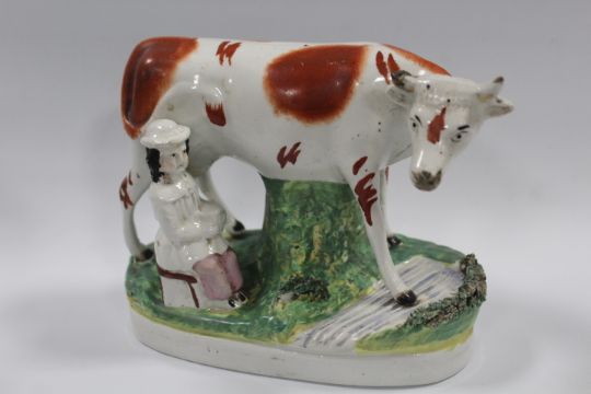 A STAFFORDSHIRE STYLE FLAT BACK FIGURE OF A COW AND MILKMAID A/F