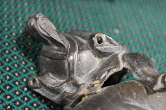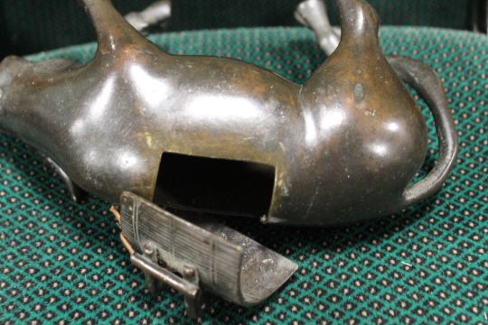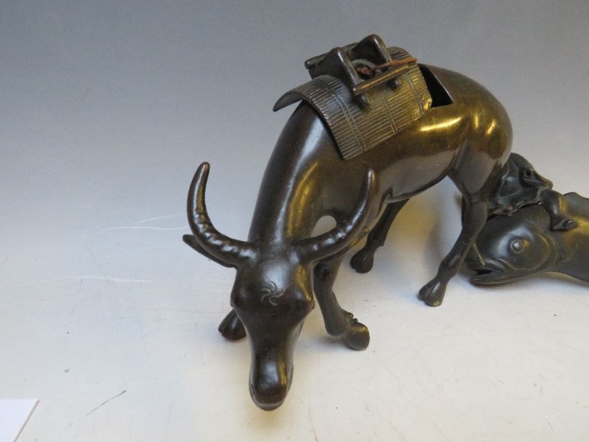 A BRONZE ORIENTAL CENSOR, modelled as an ox with removable saddle, L 22 cm, together with a Buddha on fish (2)