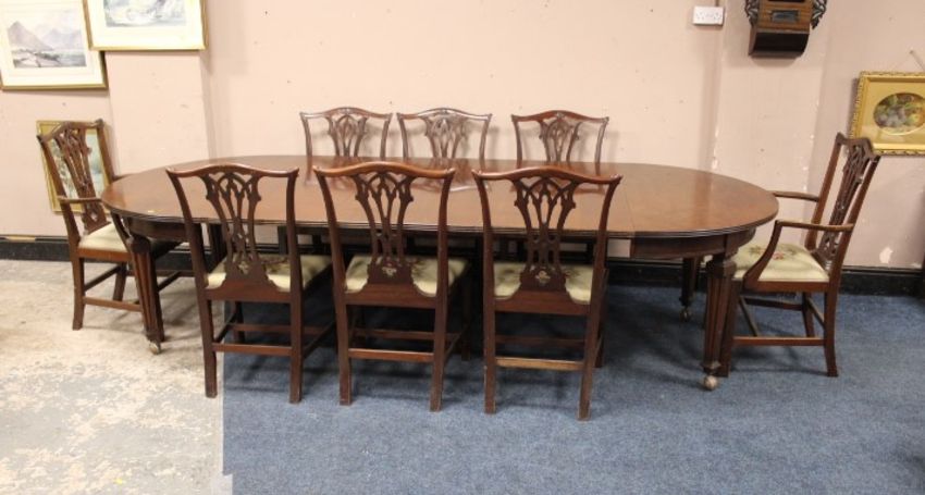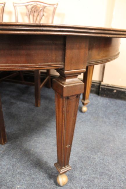 AN ANTIQUE MAHOGANY WIND-OUT DINING TABLE AND THREE LEAVES, the table raised on squared tapered supports, handle, H 75 cm, L 130 cm, (extended L 304 cm)