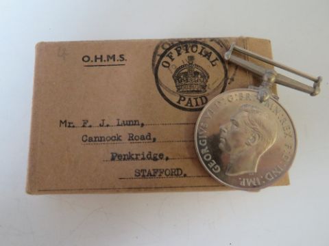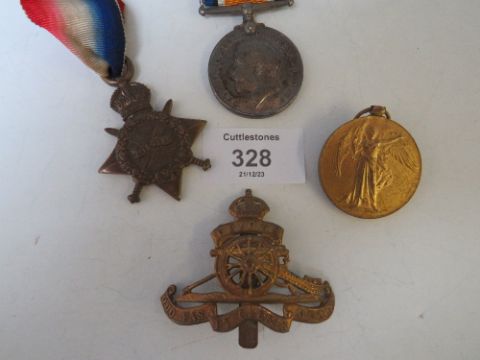 A WWI 1914 / 15 STAR TRIO, MARKED TO 91327 GNR F.J. LUNN RA, ALONG WITH A WWII DEFENCE MEDAL IN POSTAL BOX, ADDRESSED TO F.J. LUNN AND RA BADGE & SERVICE STRIPES