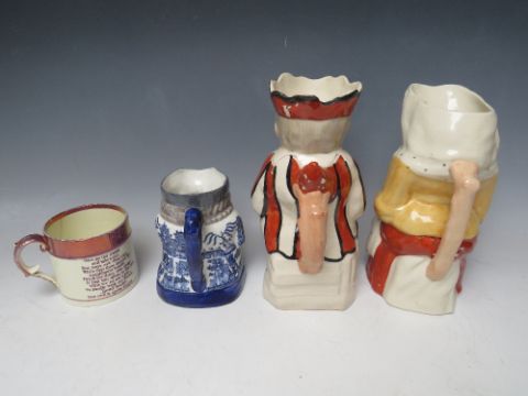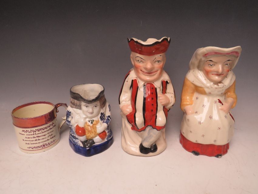 THREE ANTIQUE STAFFORDSHIRE TOBY JUGS, to include Punch and Judy, blue and white example and a lustre love mug (4)