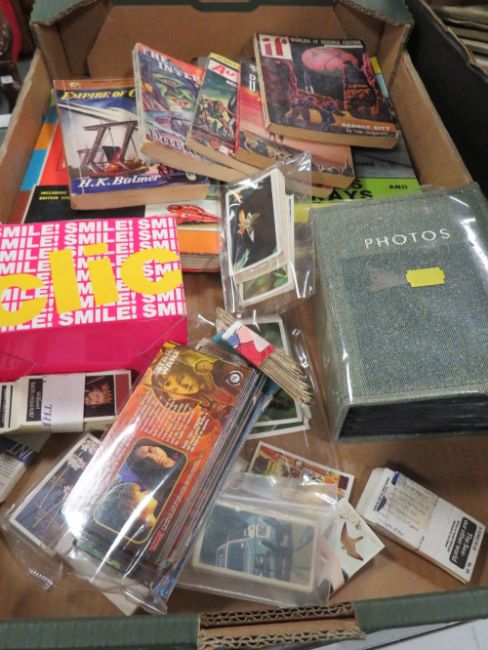 A TRAY CONTAINING A STAMP ALBUM, CIGARETTE CARDS ETC