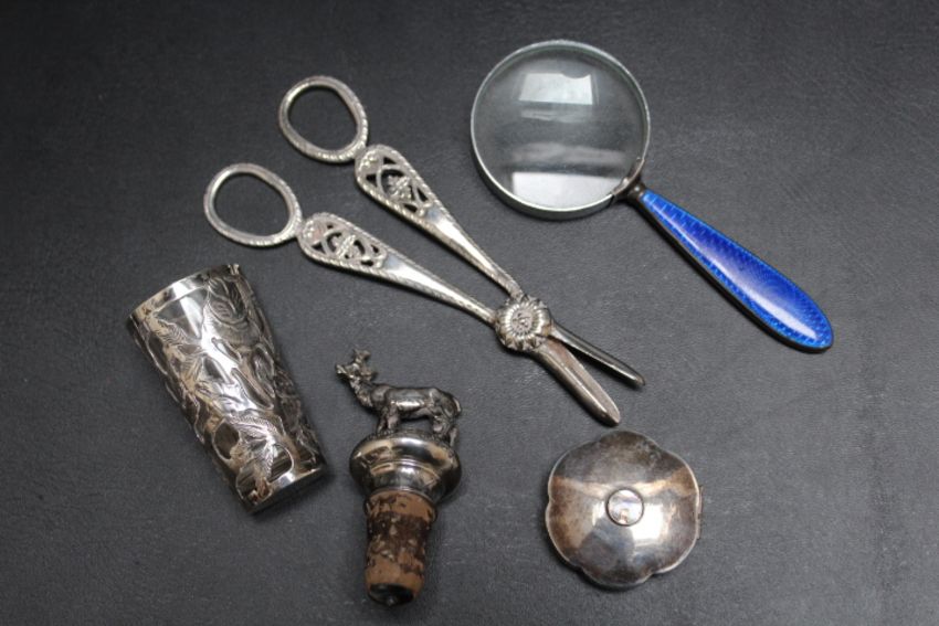 A COLLECTORS LOT OF HALLMARKED AND STERLING SILVER TO INCLUDE AN ENAMEL HANDLED MAGNIFYING GLASS - LONDON 1934, a modern pair of grape scissors - London 1977, small pieced glass lined shot cup, hallmarked bottle stopper in the form of a deer and a shaped patch box (5)