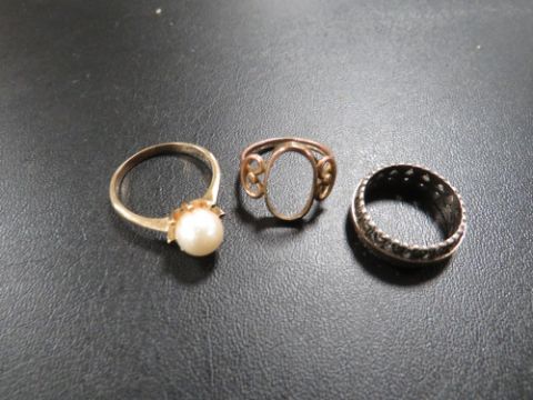 A 9CT GOLD RING MOUNT approx weight 1.7g TOGETHER WITH A INDISTINCTLY MARKED 9CT PEARL STYLE RING AND A GOLD ON SILVER ETERNITY RING (3)