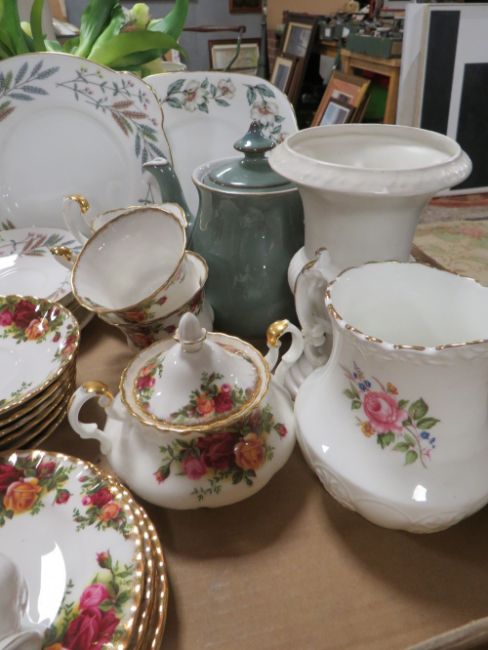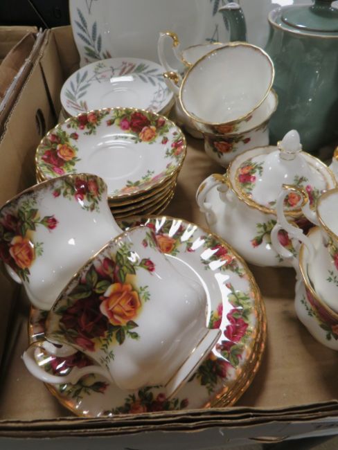 A TRAY OF ASSORTED CERAMICS TO INCLUDE ROYAL ALBERT OLD COUNTRY ROSES ETC