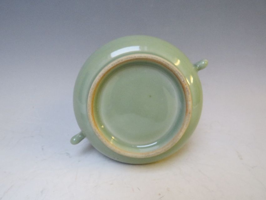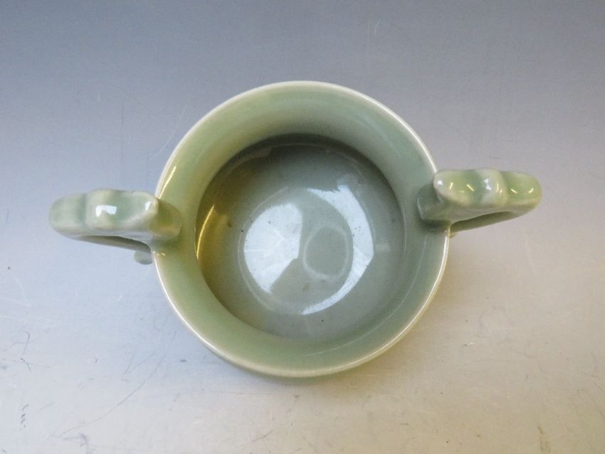 AN ORIENTAL TWIN HANDLED CELADON CENSOR, H 10.5 cm, W 15 cm
