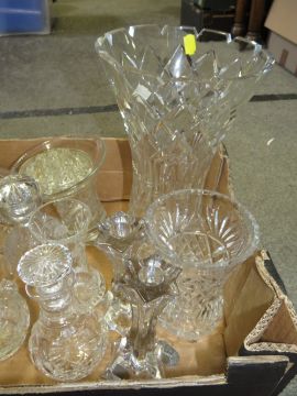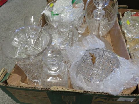 THREE TRAYS OF ASSORTED GLASS WARE TO INCLUDE DECANTERS , VASES AND CUT GLASS DRINKING GLASSES