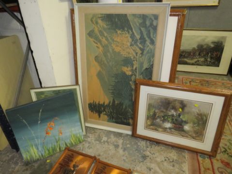 A LARGE QUANTITY OF ASSORTED PICTURES TO INCLUDE AN IMPRESSIONIST LOCOMOTIVE EXAMPLE
