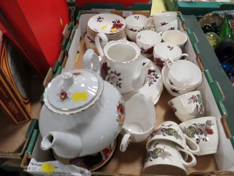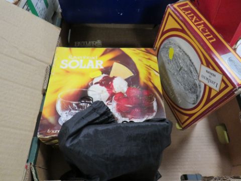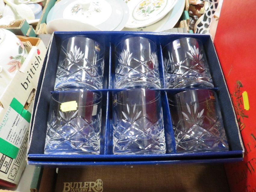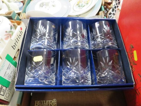 TWO TRAYS OF ASSORTED CERAMICS AND GLASS TO INCLUDE A BOX SET OF SIX GLENEAGLES CRYSTAL WHISKY TUMBLERS, RECORDS ETC