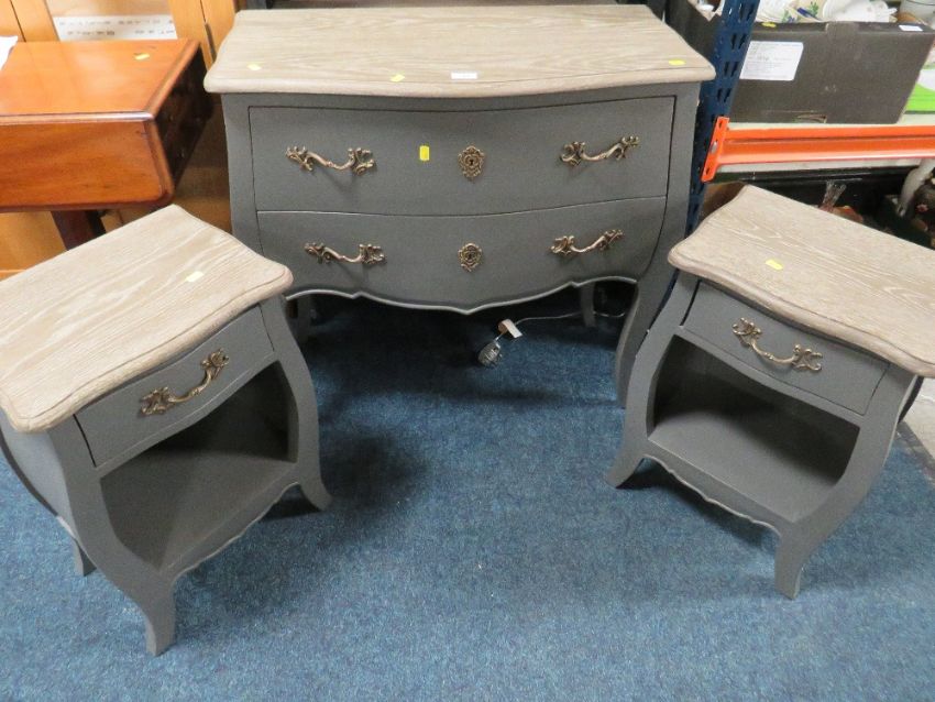 A MODERN FRENCH STYLE TWO DRAWER LIMED CHEST TOGETHER WITH TWO BEDSIDES